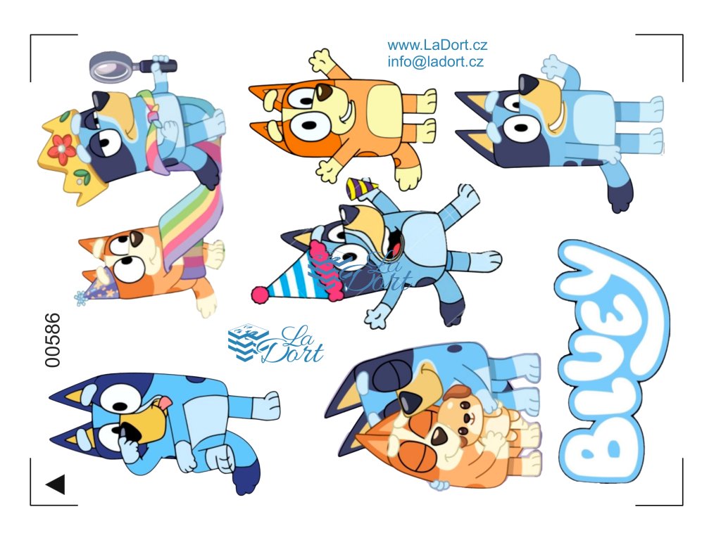 Velký nápis BLUEY: Ikonické logo seriálu, které poslouží jako výrazný prvek na čelní stranu dortu.