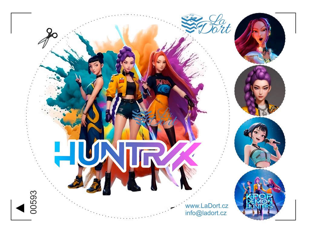 Dodejte dortu pořádnou porci energie a barev! Arch Huntrix 00593 představuje oblíbené trio v uměleckém pojetí s efektem barevných kouřových splashů. Tento moderní a stylový design je jako stvořený pro fanoušky, kteří chtějí na své oslavě spojit vášeň pro K-pop s výrazným vizuálním stylem.
