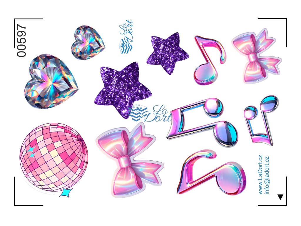 • Materiál: Pro tyto doplňky s vysokým leskem a barevnými přechody doporučujeme fondánový list. Fondán nejlépe podtrhne "kovový" a "křišťálový" vzhled not a srdcí.