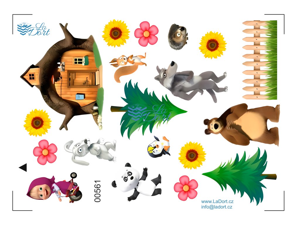 Přeneste oblíbené postavičky z pohádky Máša a Medvěd na váš dort! Tento veselý a barevný arch je plný hlavních hrdinů a jejich zvířecích kamarádů, ideální pro narozeninové oslavy všech malých fanoušků.