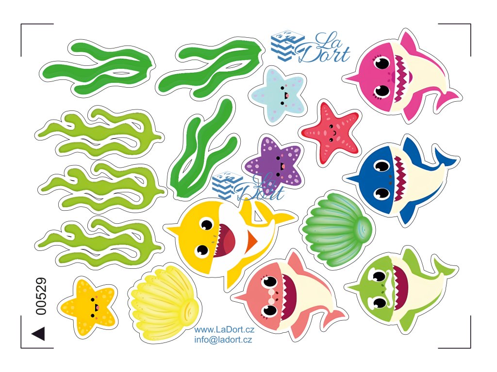 Mořské motivy: Doplňující obrázky jako zelené řasy, barevné hvězdice a krásné mušle, které dotvoří podmořskou atmosféru.