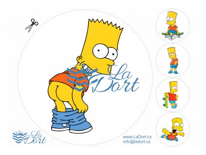 Sada postaviček z populárního seriálu Simpsnovi. Vhodné například k vystřihnutí na strany dortu, či jako dva pruhy na strany dortu. Obrázky můžete vystřihnout a přilepit na potahovací hmotu a použít i jako například zápichy na dort. Případně na sušenky, perníčky.