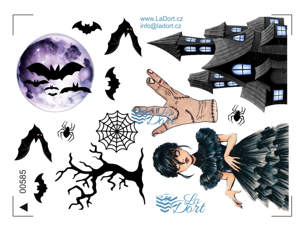 Jedlý papír na dort s motivem Wednesday Addams je skvělým doplňkem pro všechny fanoušky této kultovní postavy. Výška postavy cca 17cm, výška domu 12cm, šířka netopírů různá cca...